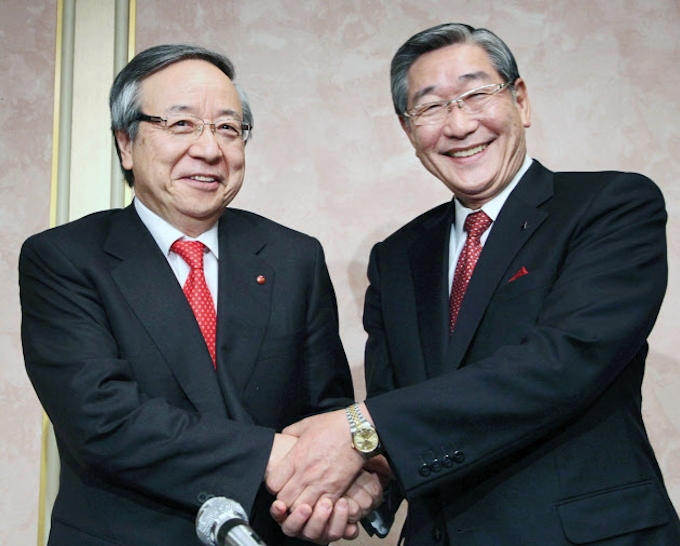 カルピスを完全子会社に 味の素 健康事業を強化 握手する両社長 カルピスを完全子会社に 経営統合についての記者会見で握手する味の素 の山口範雄社長 左 とカルピスの石渡総平社長 11日午後 東京都千代田区 四国新聞社