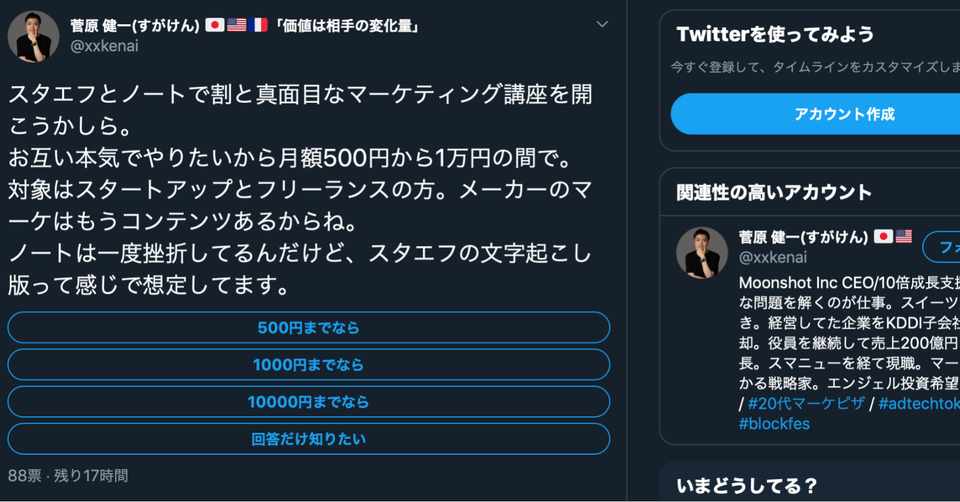 質問 スタートアップとフリーランス向けのマーケティング講座を開始するなら興味ありますか ツイッターのアンケートにご協力ください 企業の10倍成長に効くノート 株式会社ムーンショット Xxkenai